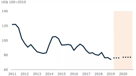 根據(jù)世界銀行的預測,飲料價格指數(shù)在2019年下降5%之后,預計2020年將上升2%。世界銀行在11月將飲料價格的經濟預測進行了上調,并預測下降趨勢將在2020年穩(wěn)定下來。世界銀行飲料指數(shù)